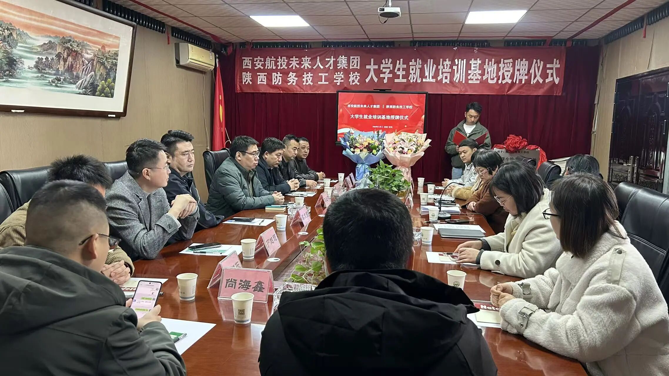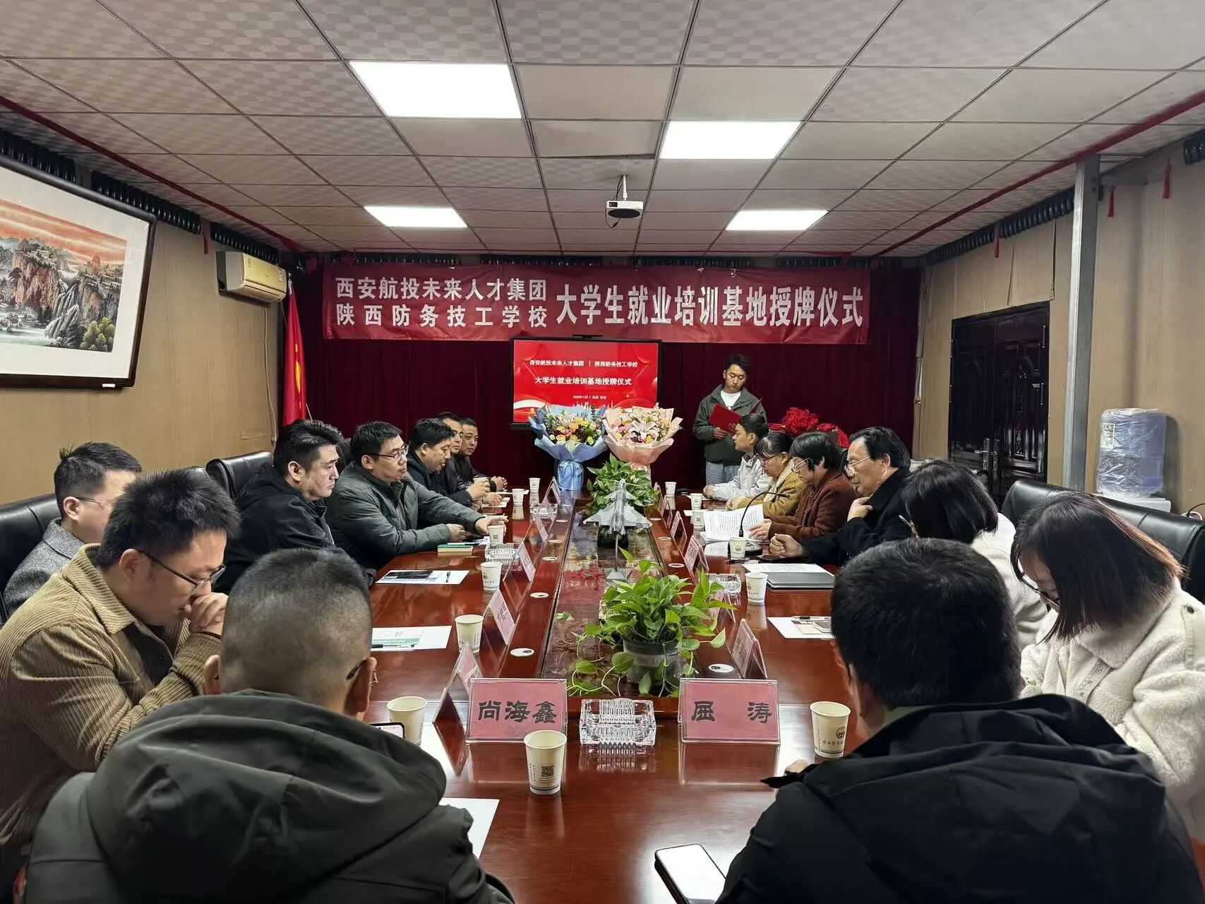 2025 年 11 月 15 日上午 9 时 09 分,西安航投未来人才集团与陕西防务技工学校 “大学生就业培训基地” 授牌仪式在学校会议室隆重举行。此次合作标志着双方在产教融合、人才共育领域迈出关键一步,为社会培养更多实战型技术人才搭建了坚实的平台。